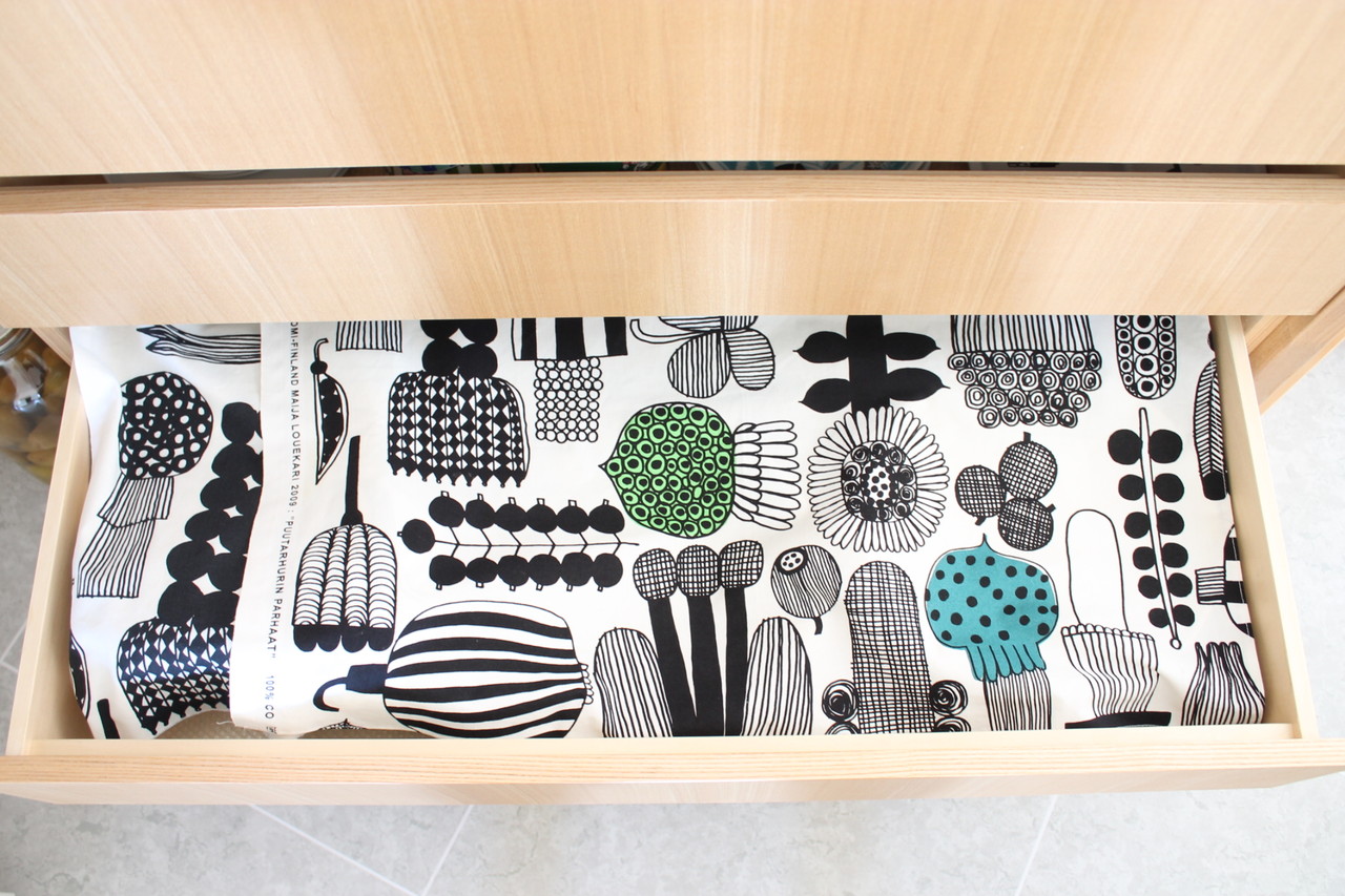引き出しが隙間の空いたデザインなので埃よけにファブリックをかけていました。