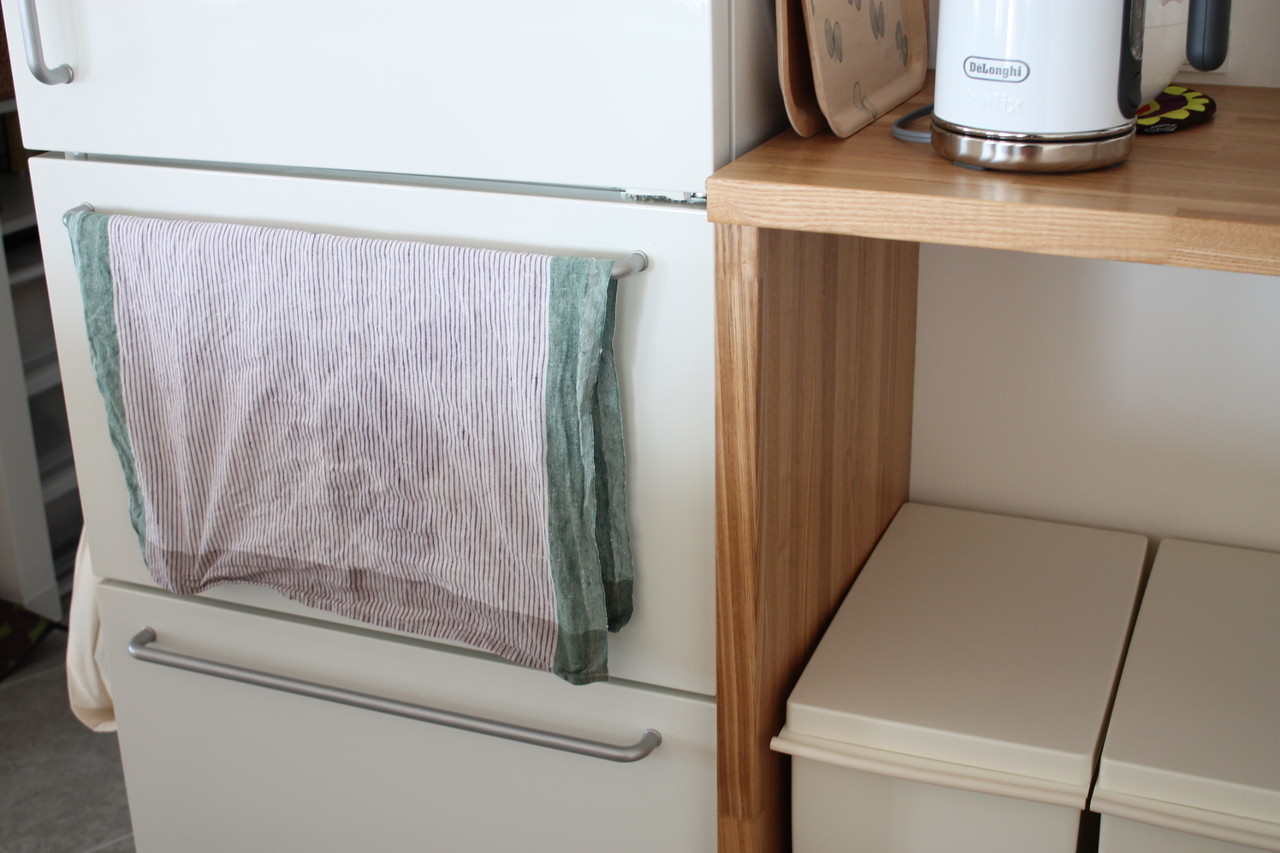 使い終わったら冷蔵庫の取っ手にかけて乾かします。